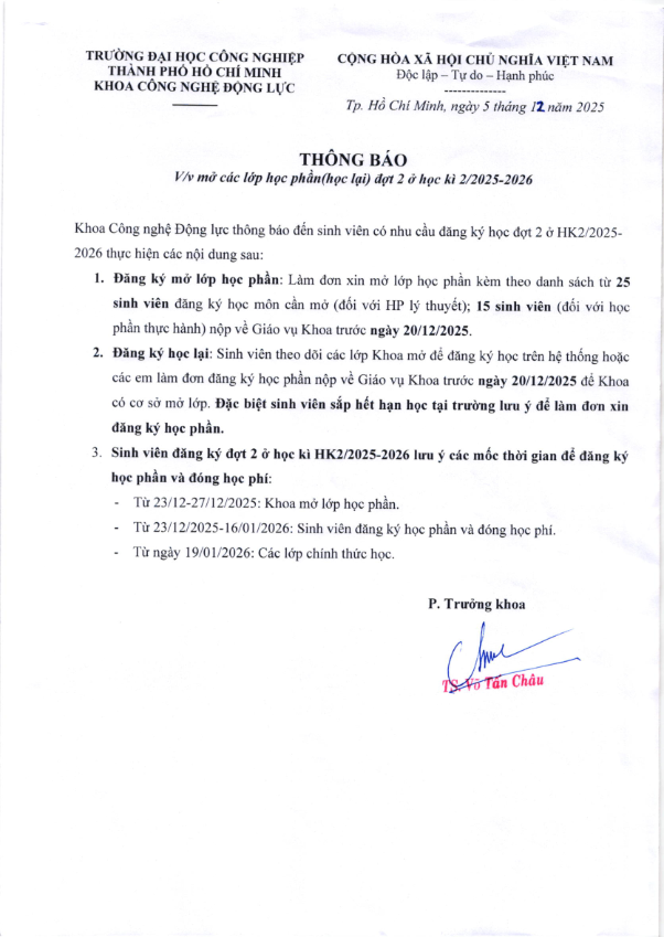 Thông báo v/v mở các lớp học phần (học lại) đợt 2 học kỳ 2 năm học 2025 - 2026