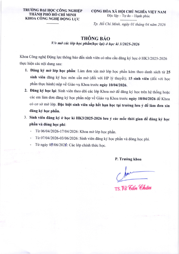 Thông báo V/v mở các lớp học phần (học lại) ở học kỳ 3 năm học 2025 - 2026